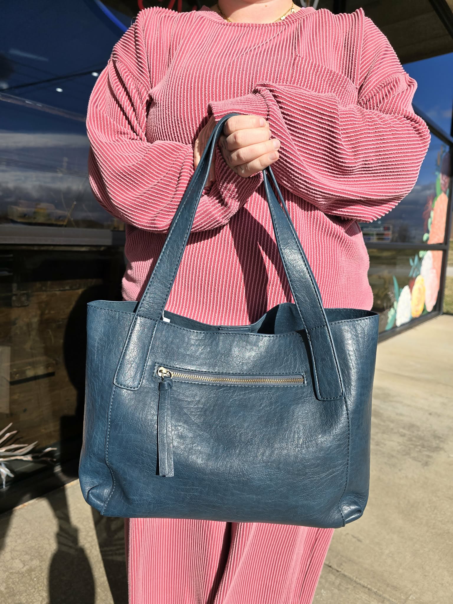 - Two great bags in one! The Lottie is a medium sized tote with a modern east west shape in gorgeous Buffalo grain vegan leather with a bonus interior bag that can be used as a storage pouch inside the tote or taken out and worn on its own as a crossbody bag with the included crossbody shoulder strap. Either way this bag is a great value with chic style!