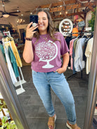 • Bring a burst of joy to your outfit with this berry-hued tee showcasing an adorable floral globe. Its lively colors and whimsical pattern are ideal for adding a cheerful vibe to any casual look. Cozy and soft, it’s the perfect pick for easygoing style with a fun flair.
