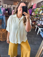 Boxy Cut Satin Pleated Button Down Collared Shirt with Low Edge Hem on Sleeves