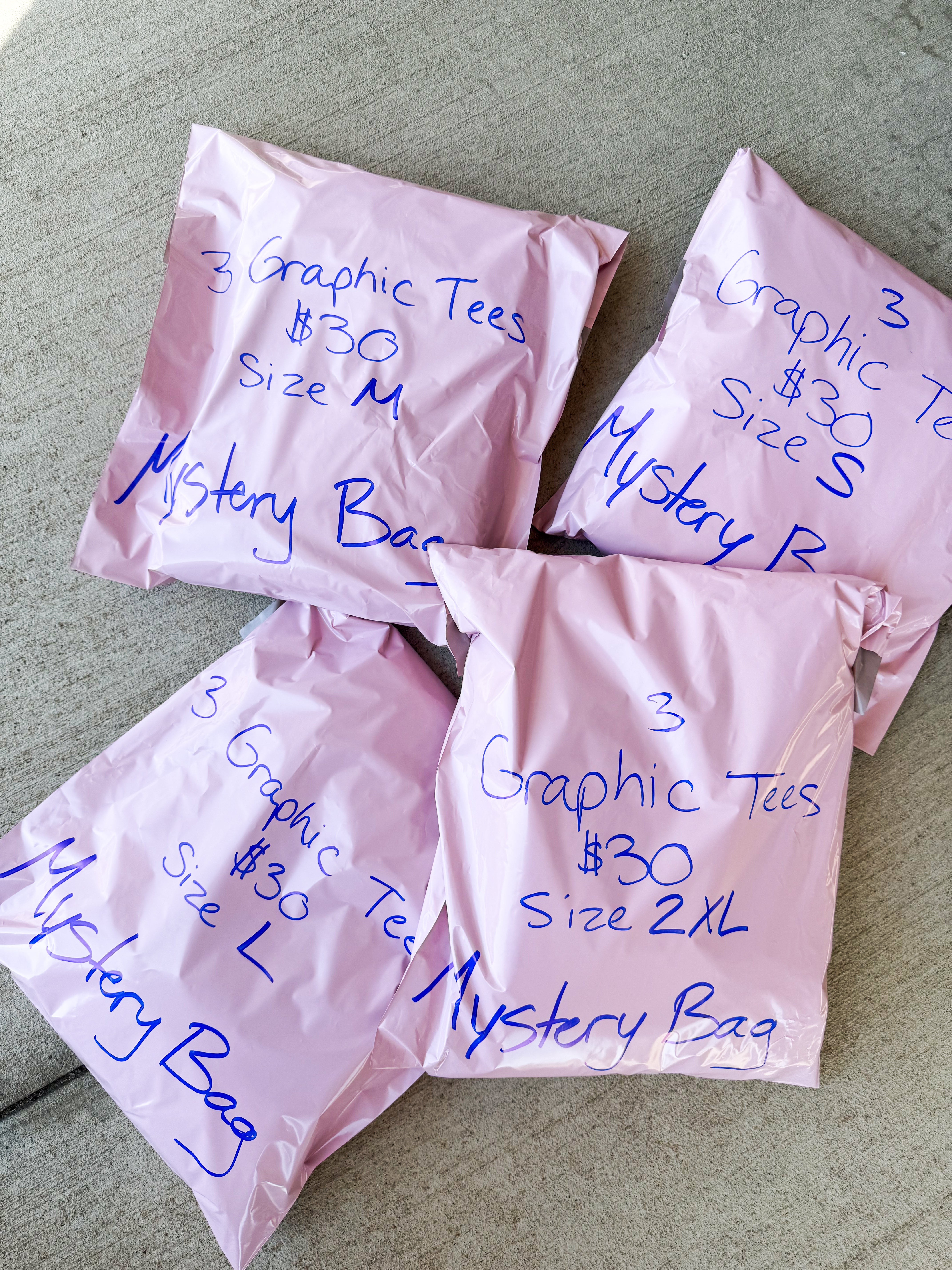 - Snag one of these graphic tee mystery bags before they are gone!! You are getting these tees at a STEAL OF A DEAL!! Some bags include long sleeves, v-necks, baseball tees, & short sleeves! Each bag is a surprise!