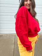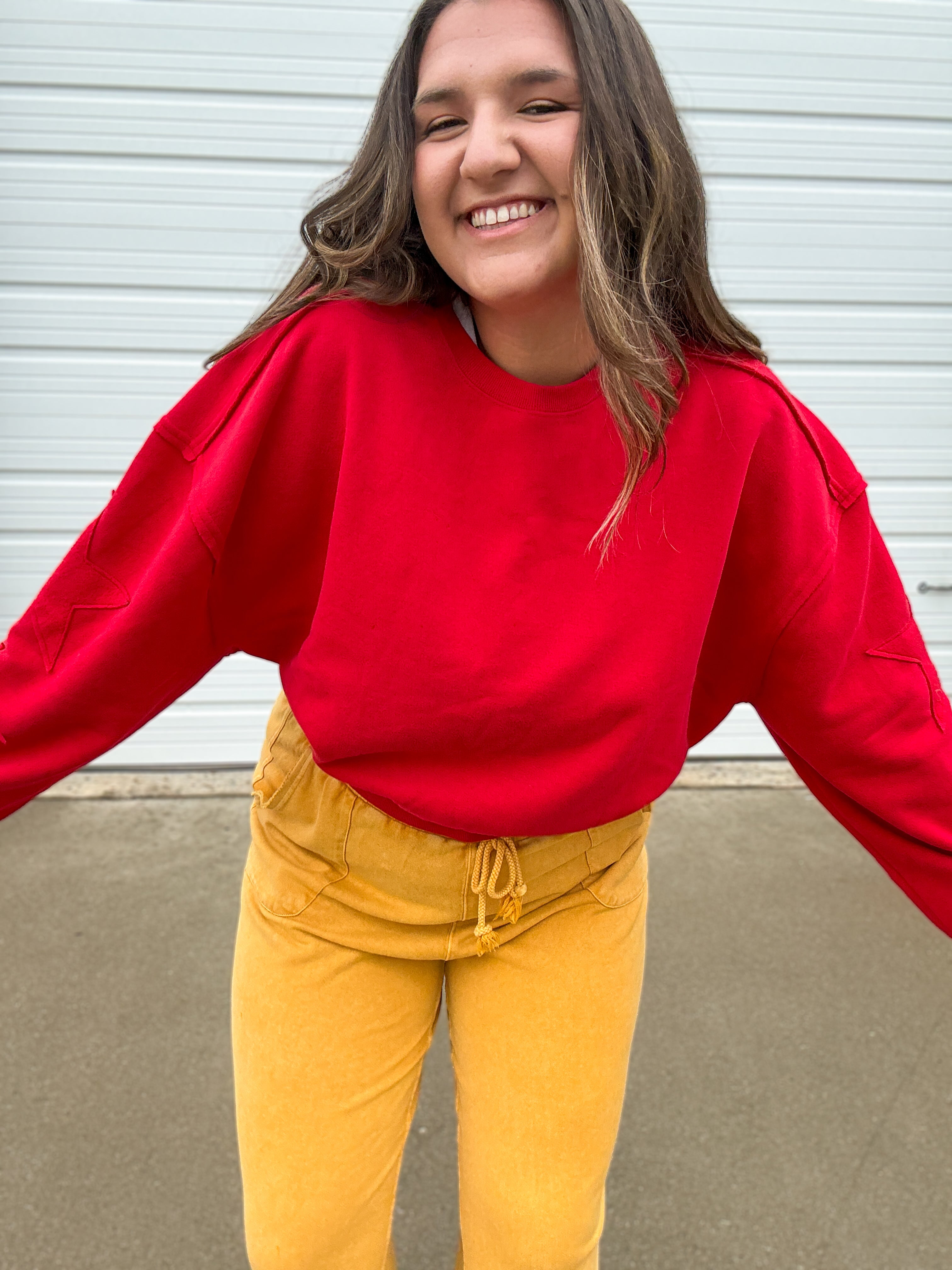 Let's take your wardrobe to a new level with this adorable, unique STAR patch sweatshirt!! With a slight cropped fit and loose sleeves, this will go great with your favorite denim, structured jacket and so much more!!