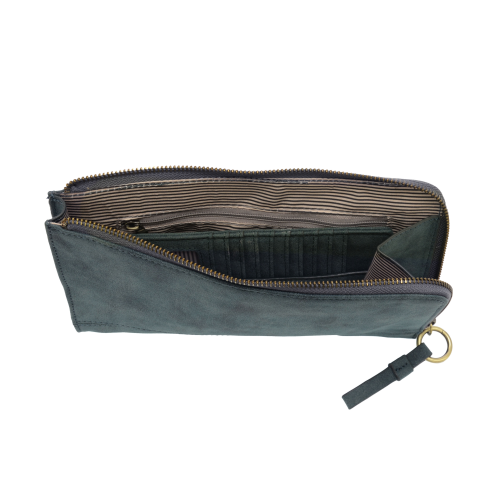 - Karina combines sleek styling with uber organization in a beautiful antique looking vegan leather! The ultimate in versatility, this bag can be worn as a crossbody, carried as a clutch or as a wristlet. The included bonus wallet with credit card slots, ID windows, zippered change pocket and billfold will keep your organized on the go and can be carried separately.