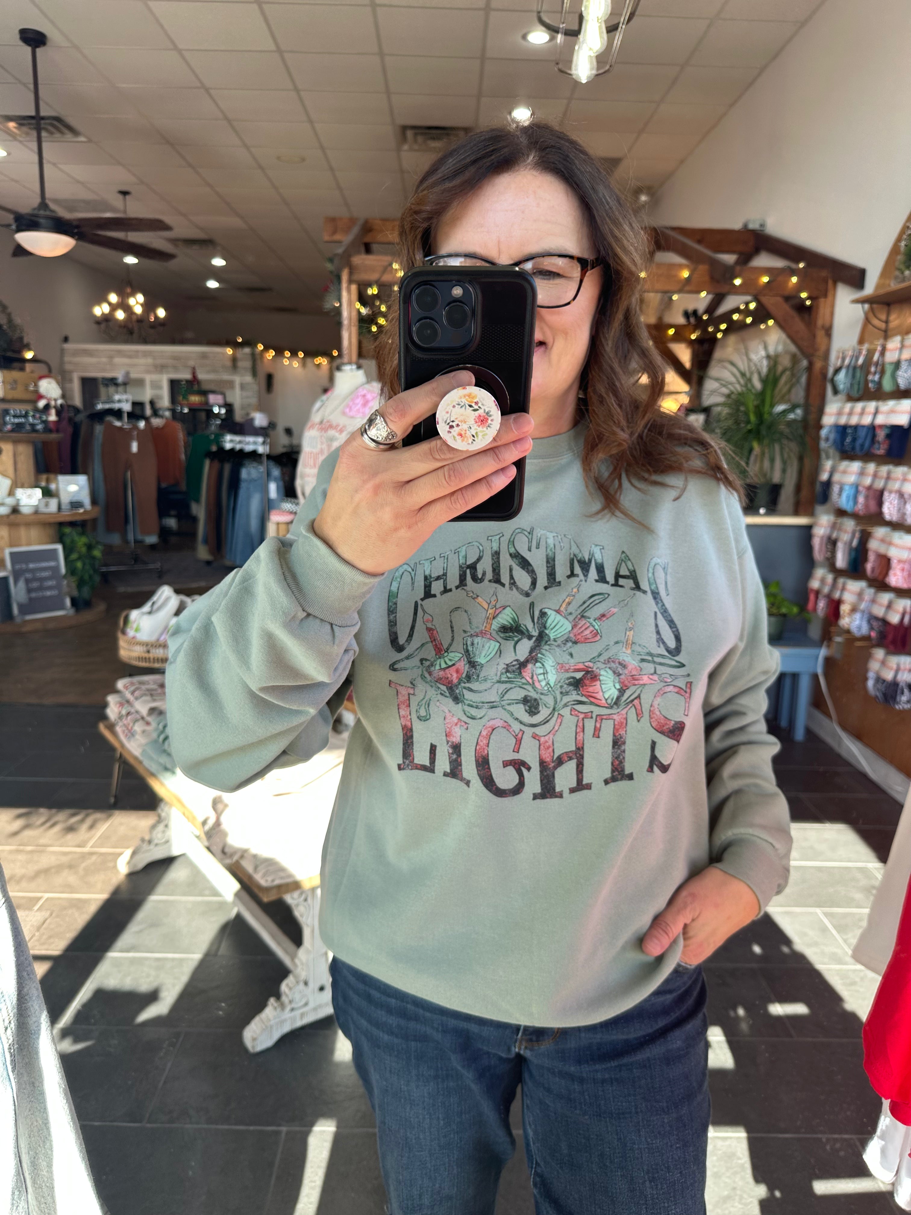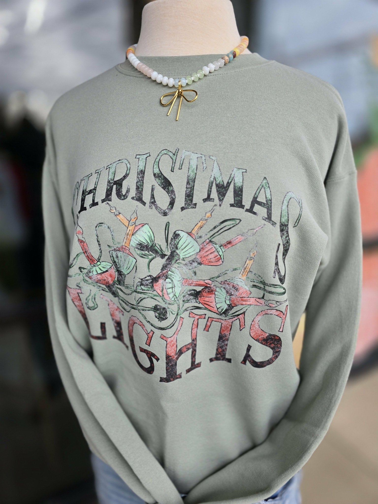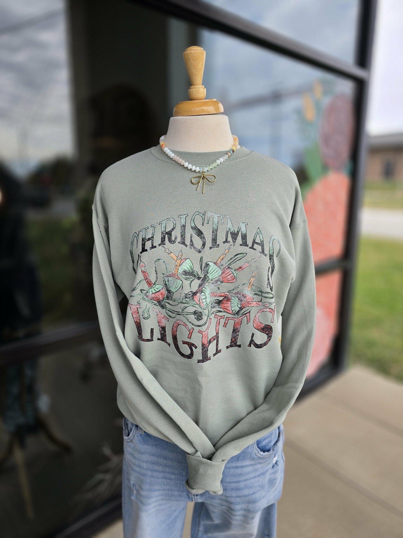 Get ready to light up the holiday season with our Christmas Lights Sweatshirt! This festive green sweatshirt features bright and colorful Christmas lights that are sure to spread cheer wherever you go. Stay cozy and stylish while showing off your love for the holidays. (Deck the halls (and yourself) with this merry sweatshirt!)