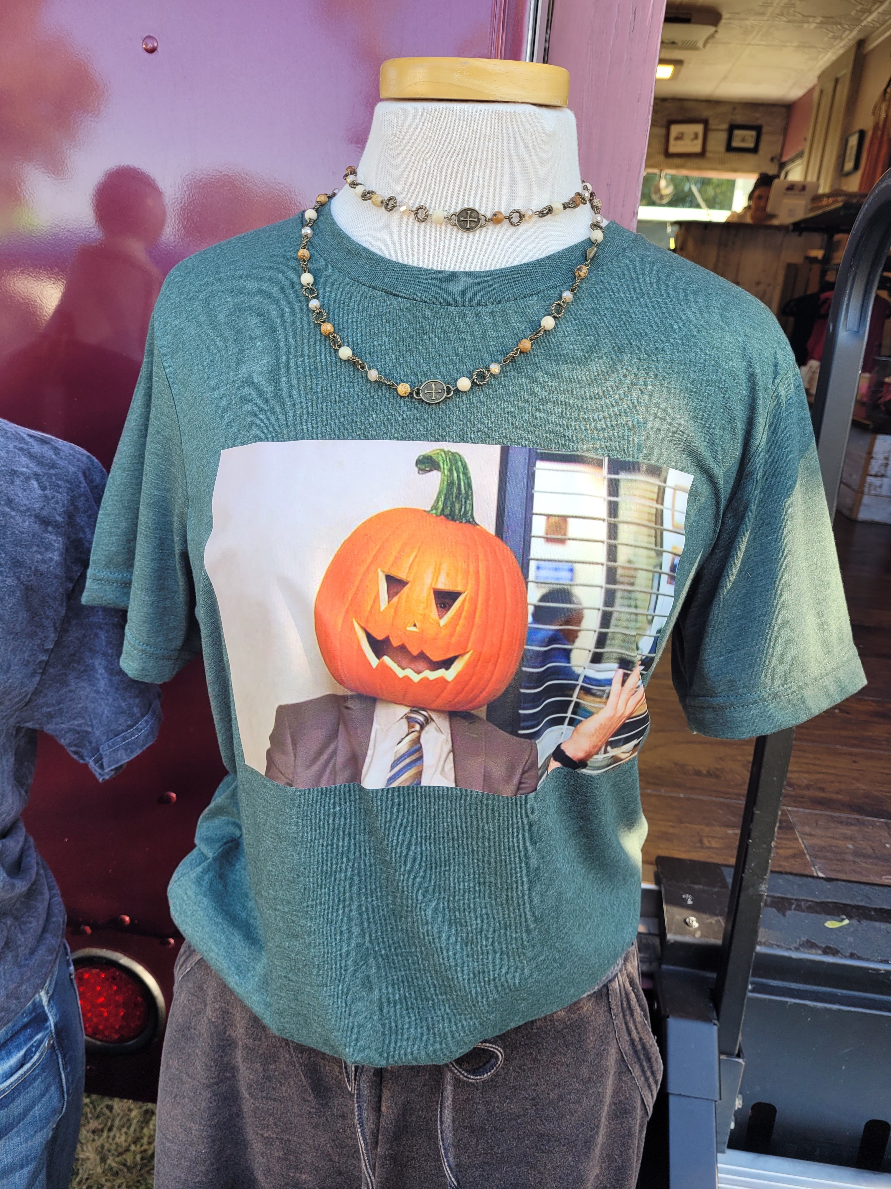 Get into the Halloween spirit with the fun and quirky Dwight Pumpkin Head Tee. Featuring a graphic of everyone's favorite character from The Office, this tee is perfect for any fan looking for a playful and humorous addition to their wardrobe. Embrace your inner Dwight and rock this unique pumpkin head design!