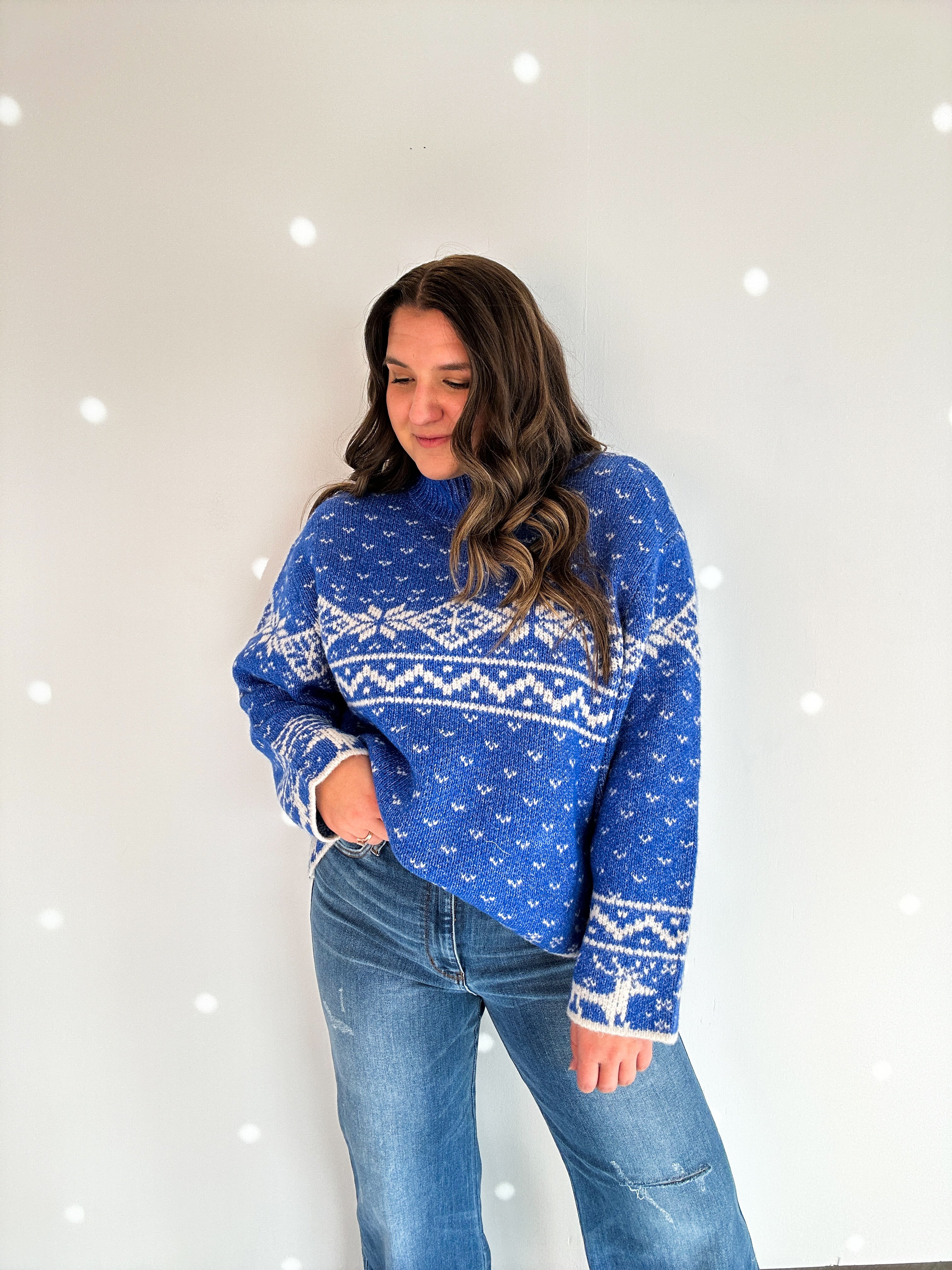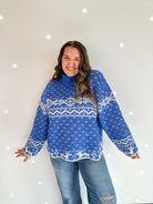 • Add a touch of holiday cheer to your wardrobe with this oversized Nordic knit sweater! Featuring a drop shoulder, long sleeves, and mock neck, it's the perfect cozy top for any occasion.
