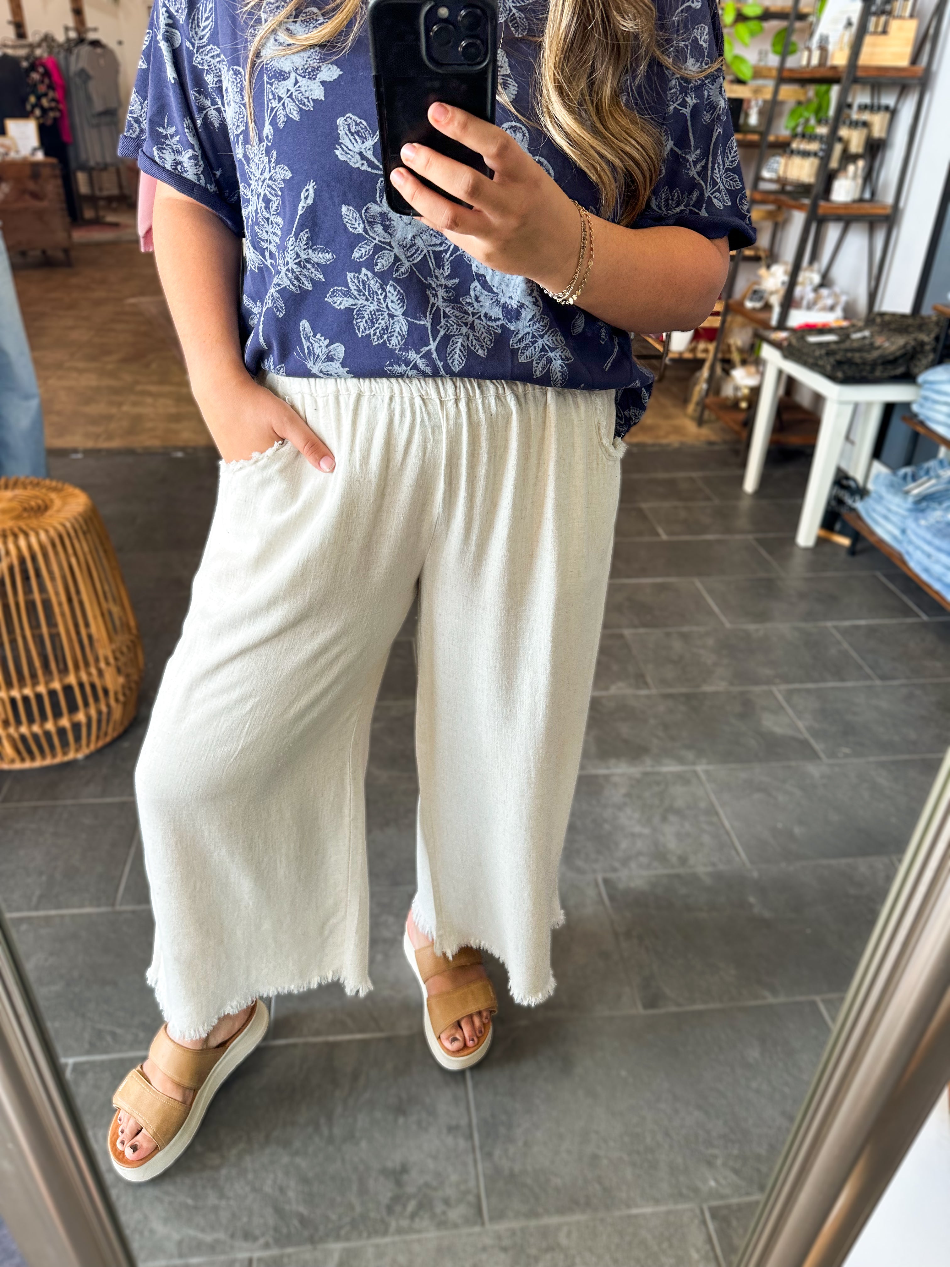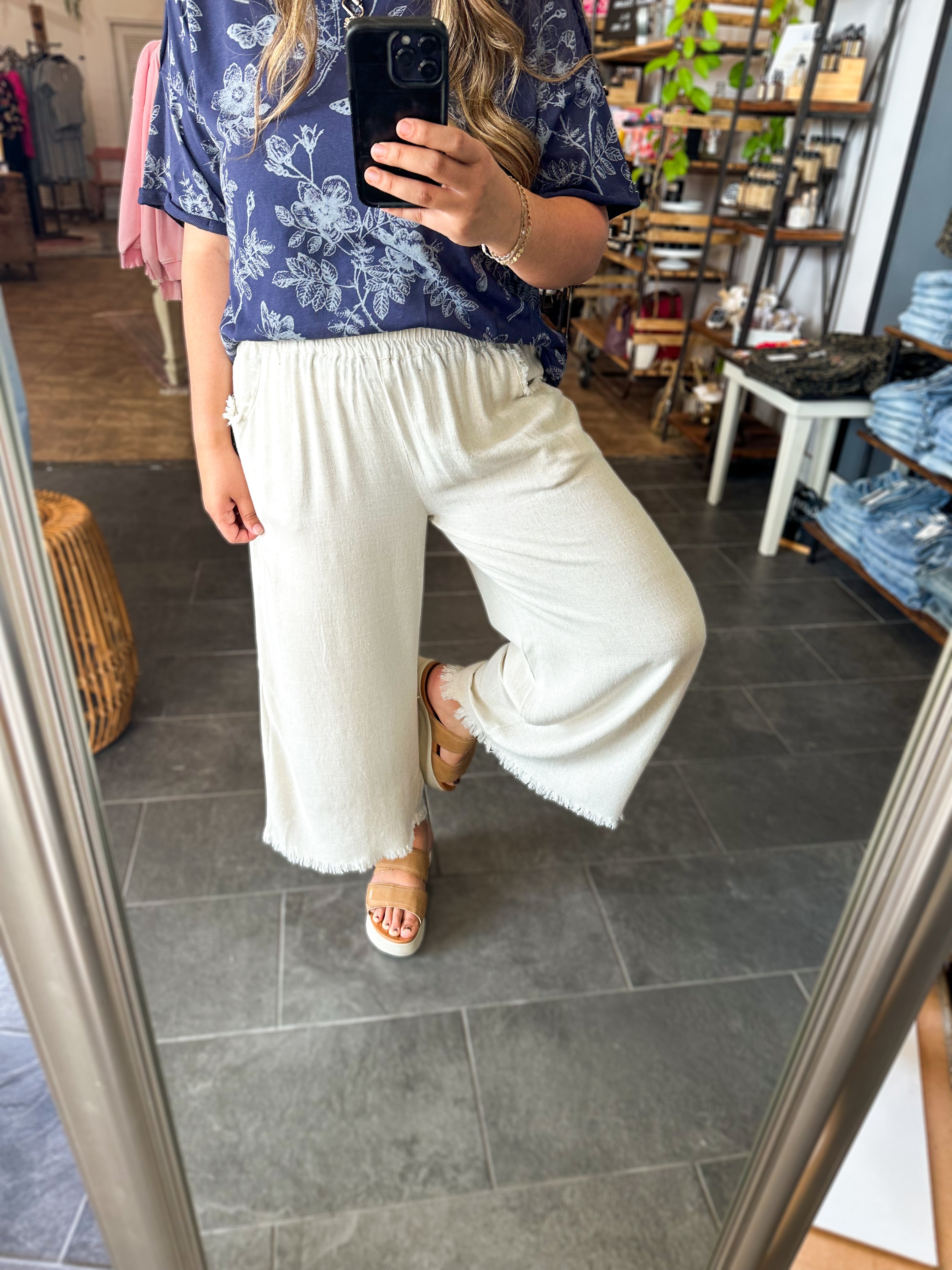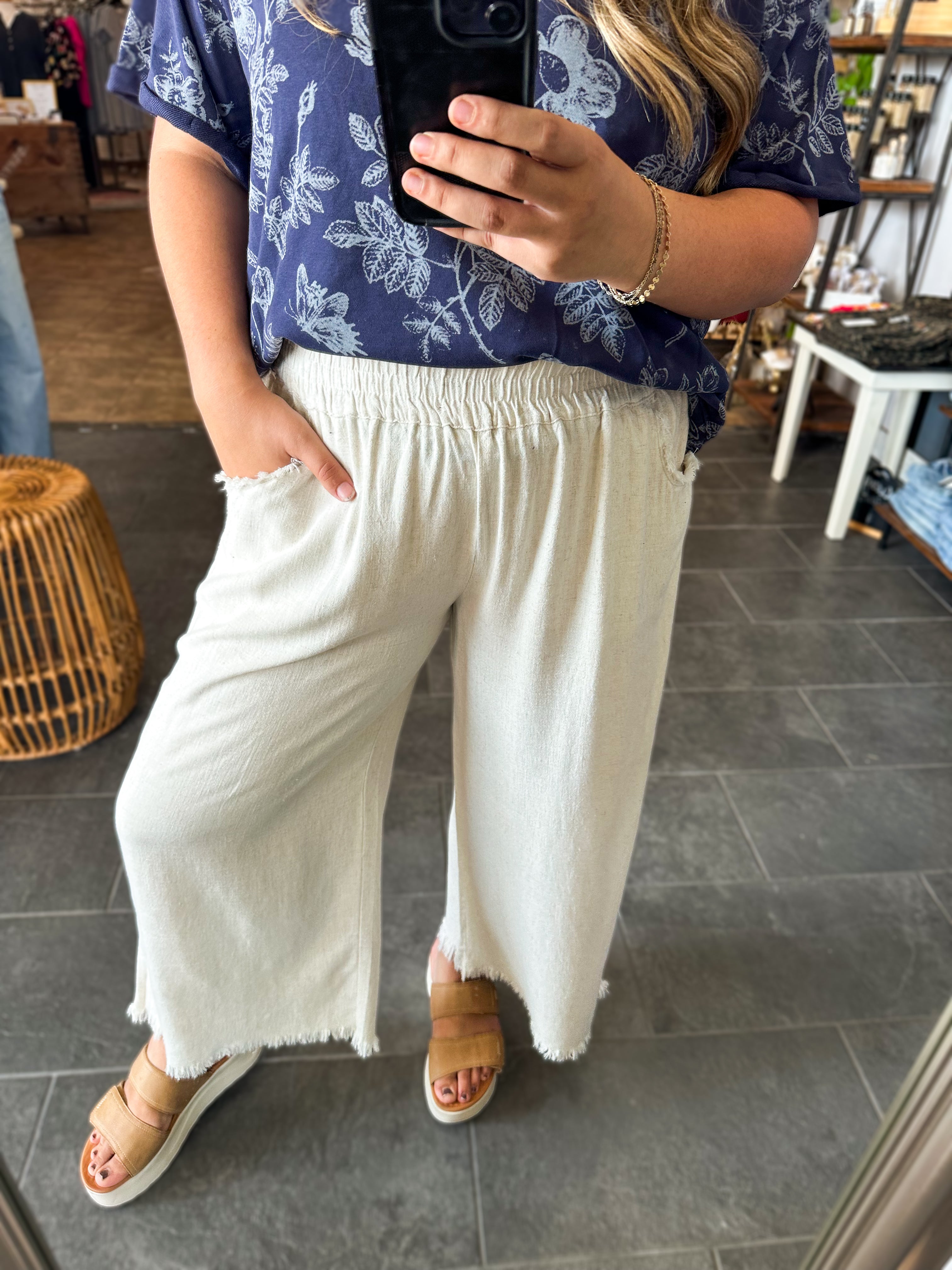 • Want effortless style?? Look no further with these wide leg pants!! With breezy linen material and a relaxed wide-leg that moved with you.  Not to mention that it has POCKETS and a fun raw frayed hem to add a playful touch.