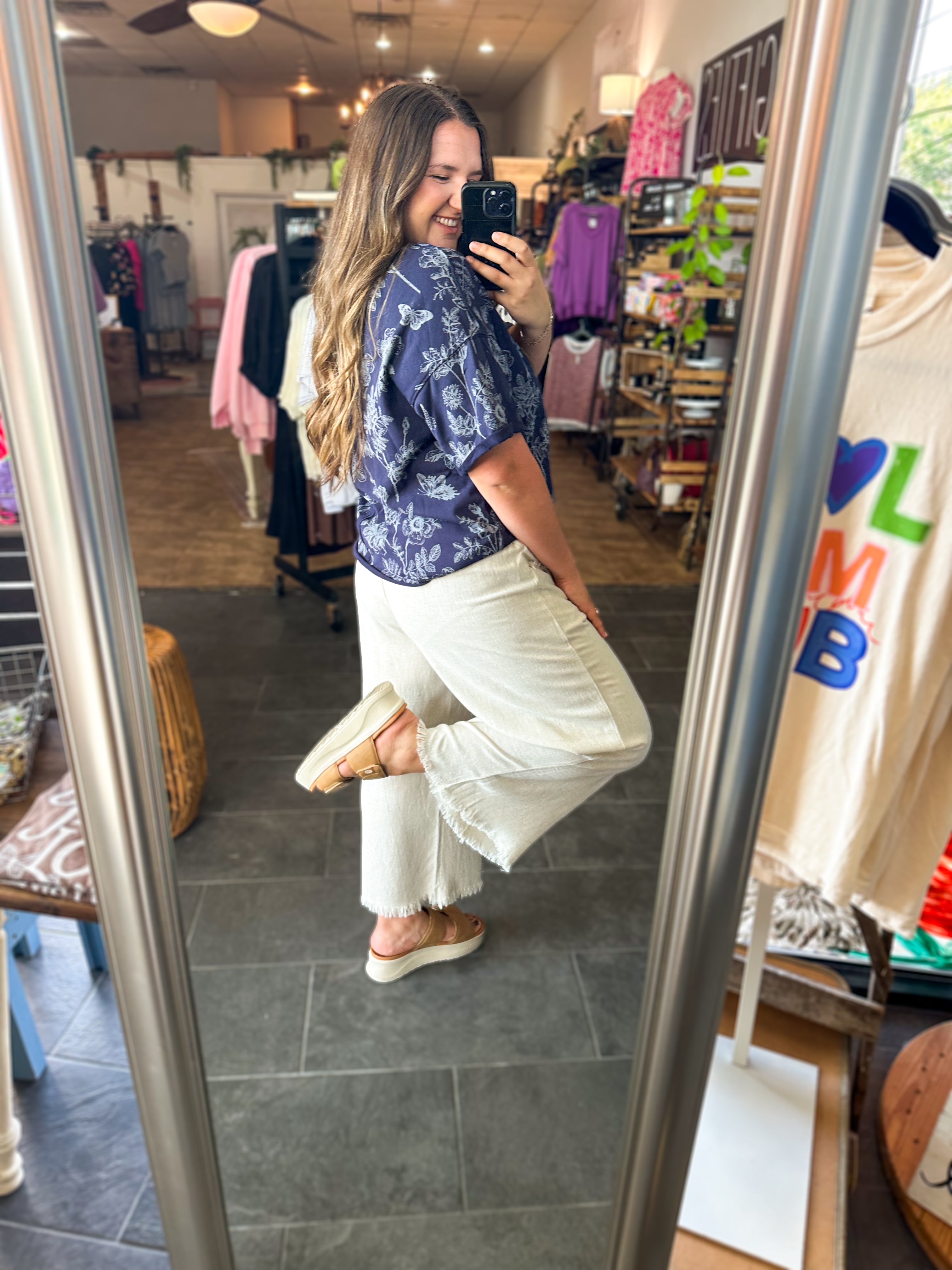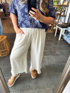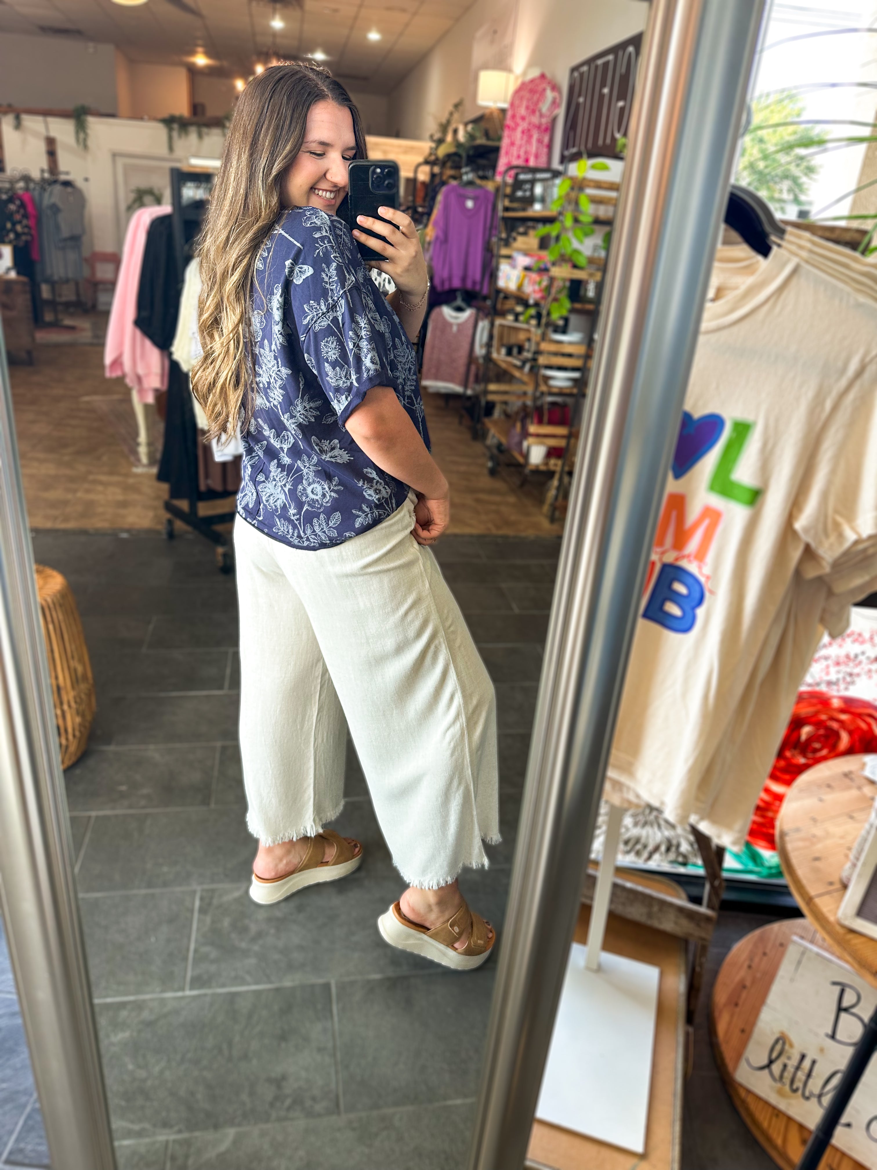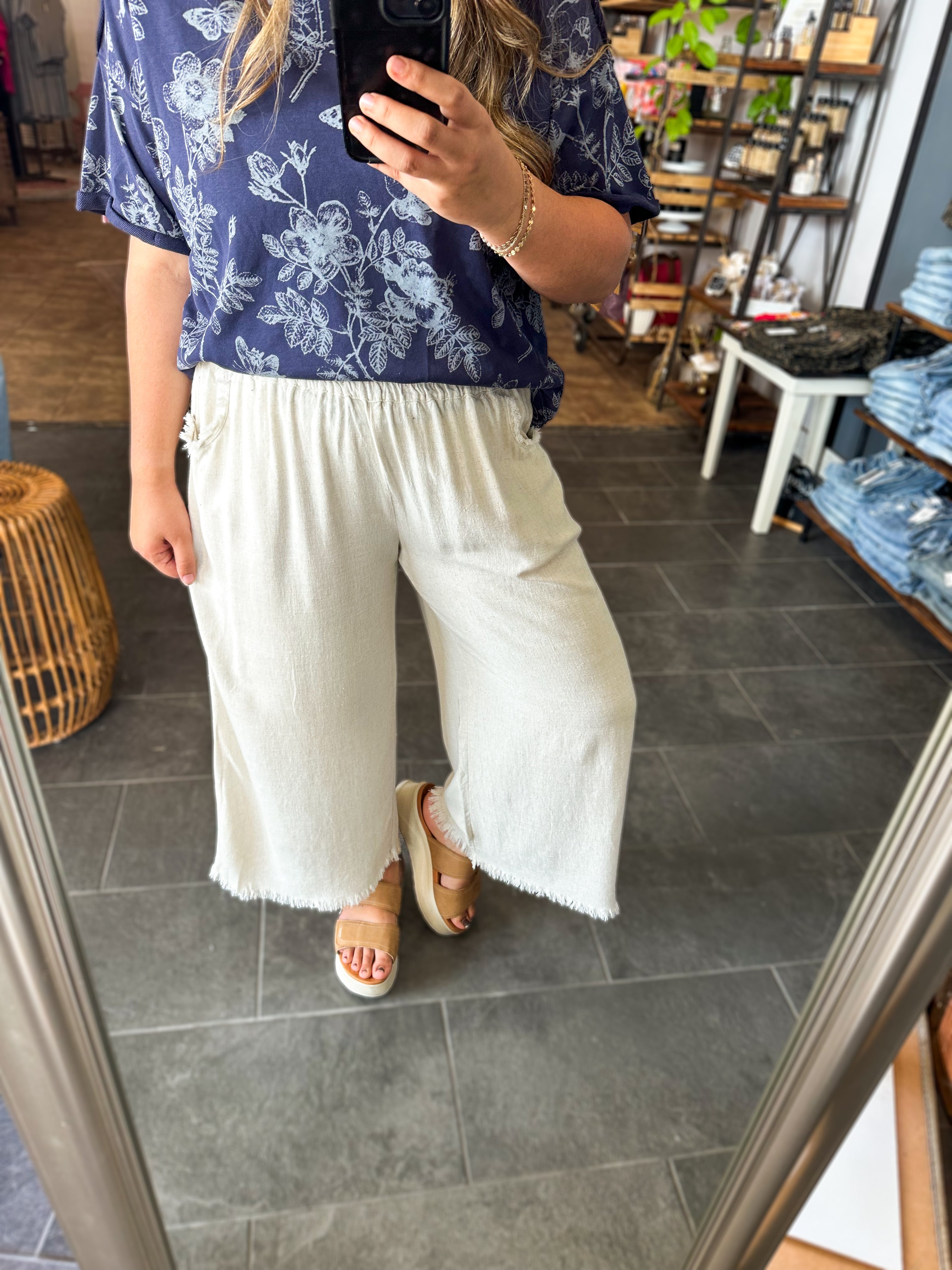 • Want effortless style?? Look no further with these wide leg pants!! With breezy linen material and a relaxed wide-leg that moved with you.  Not to mention that it has POCKETS and a fun raw frayed hem to add a playful touch.