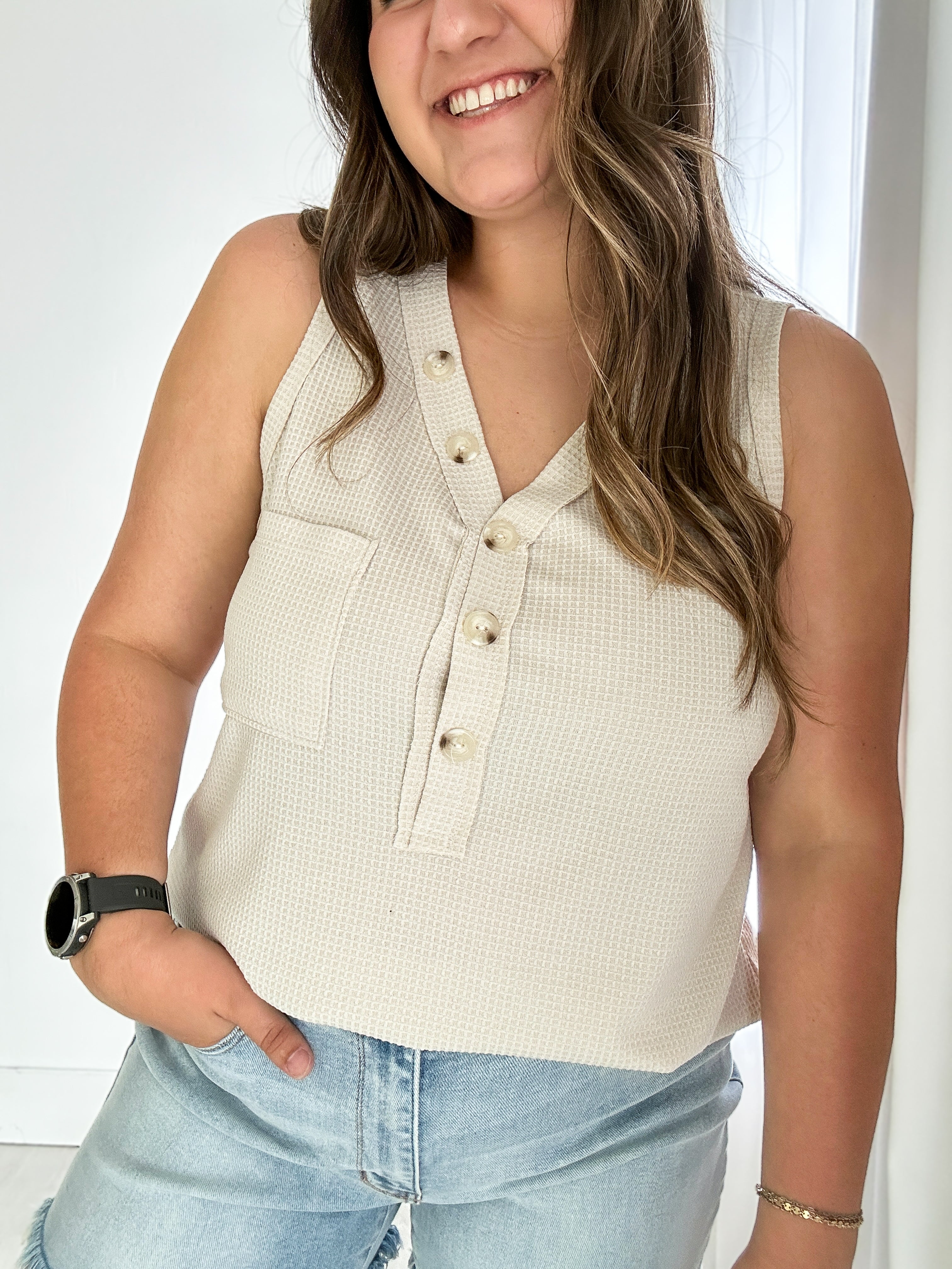 Get ready to elevate your casual style with the Blake Waffle Knit Tank!! Made from waffle knit material, this V-neck henley tank top is both comfortable and stylish. And with a front pocket, you'll have a convenient place to store your essentials. Perfect for any laid-back occasion!!