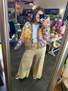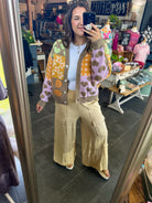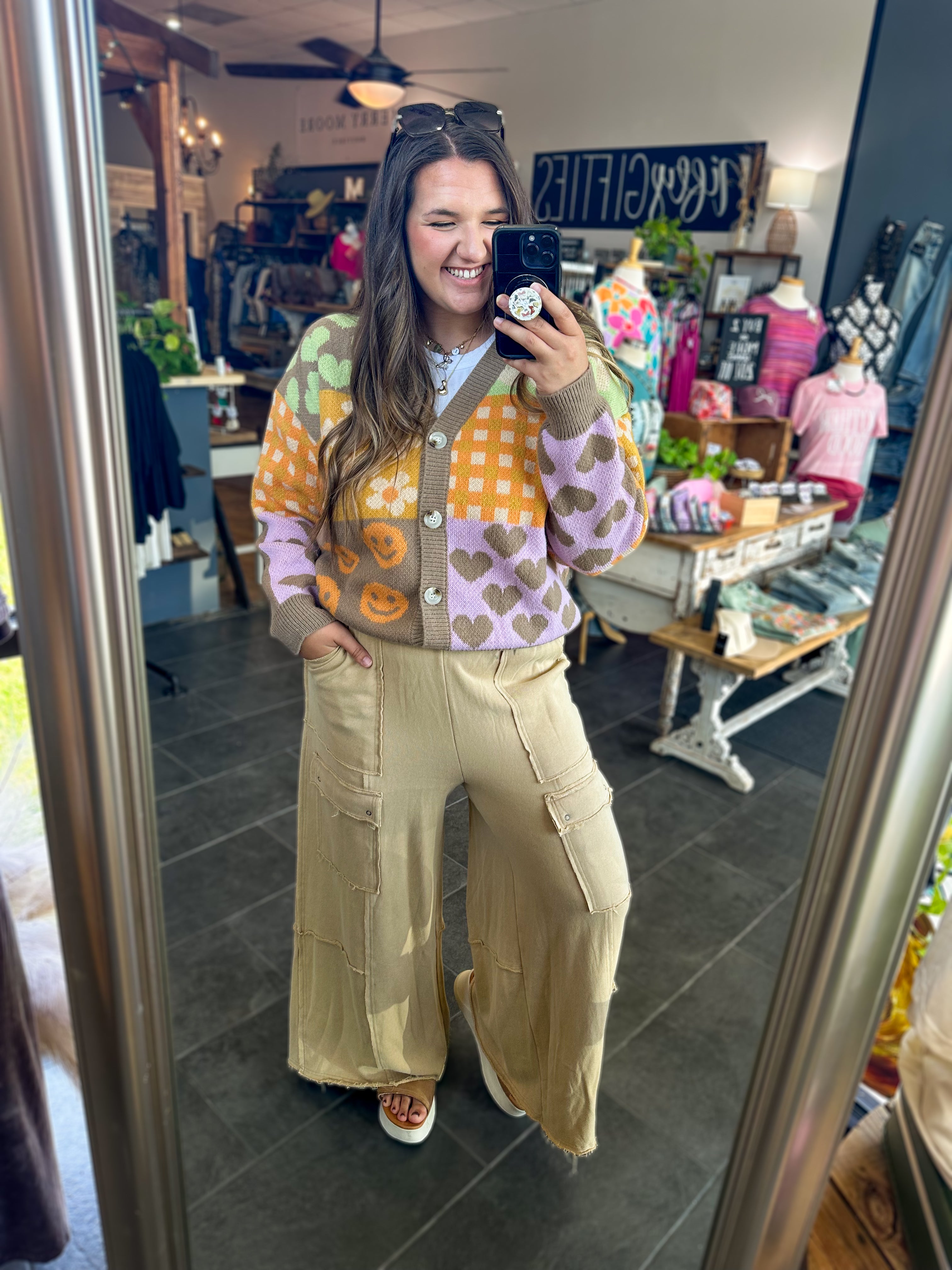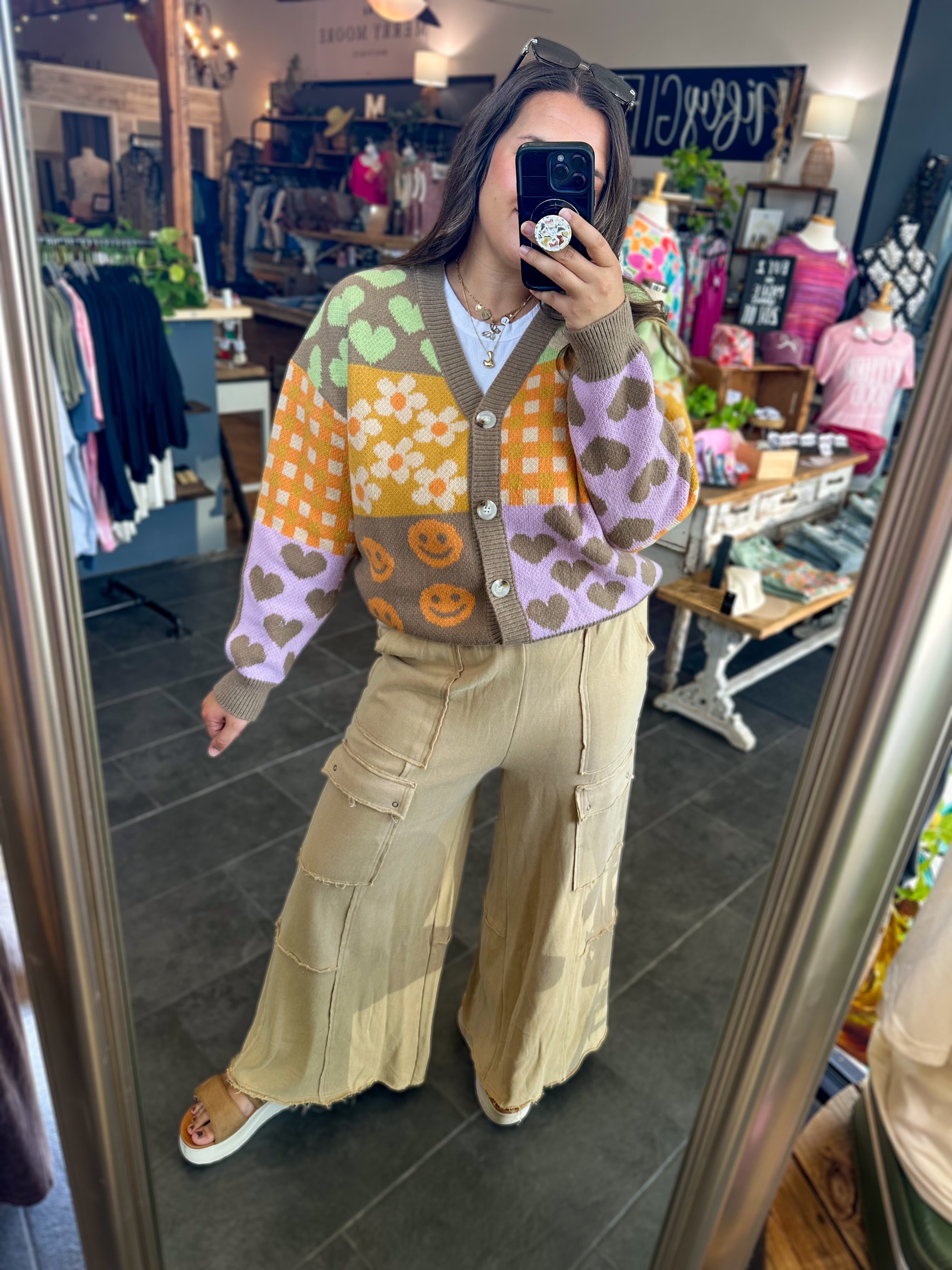 - This cozy cardigan features a fun, playful patchwork knit design and with the v-neck and button front, it adds a cheerful touch to any look!!