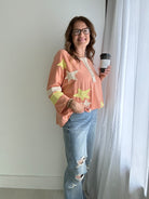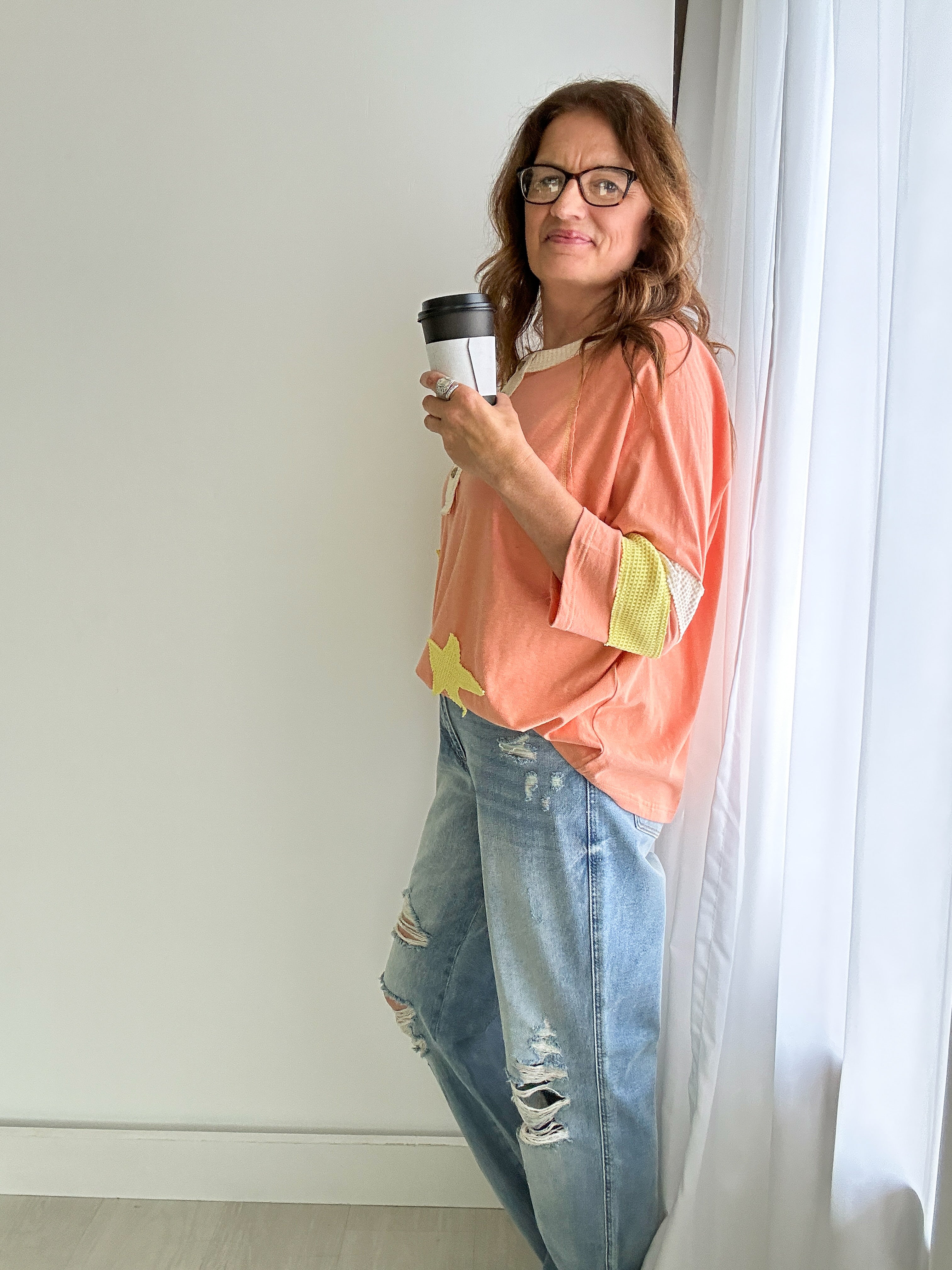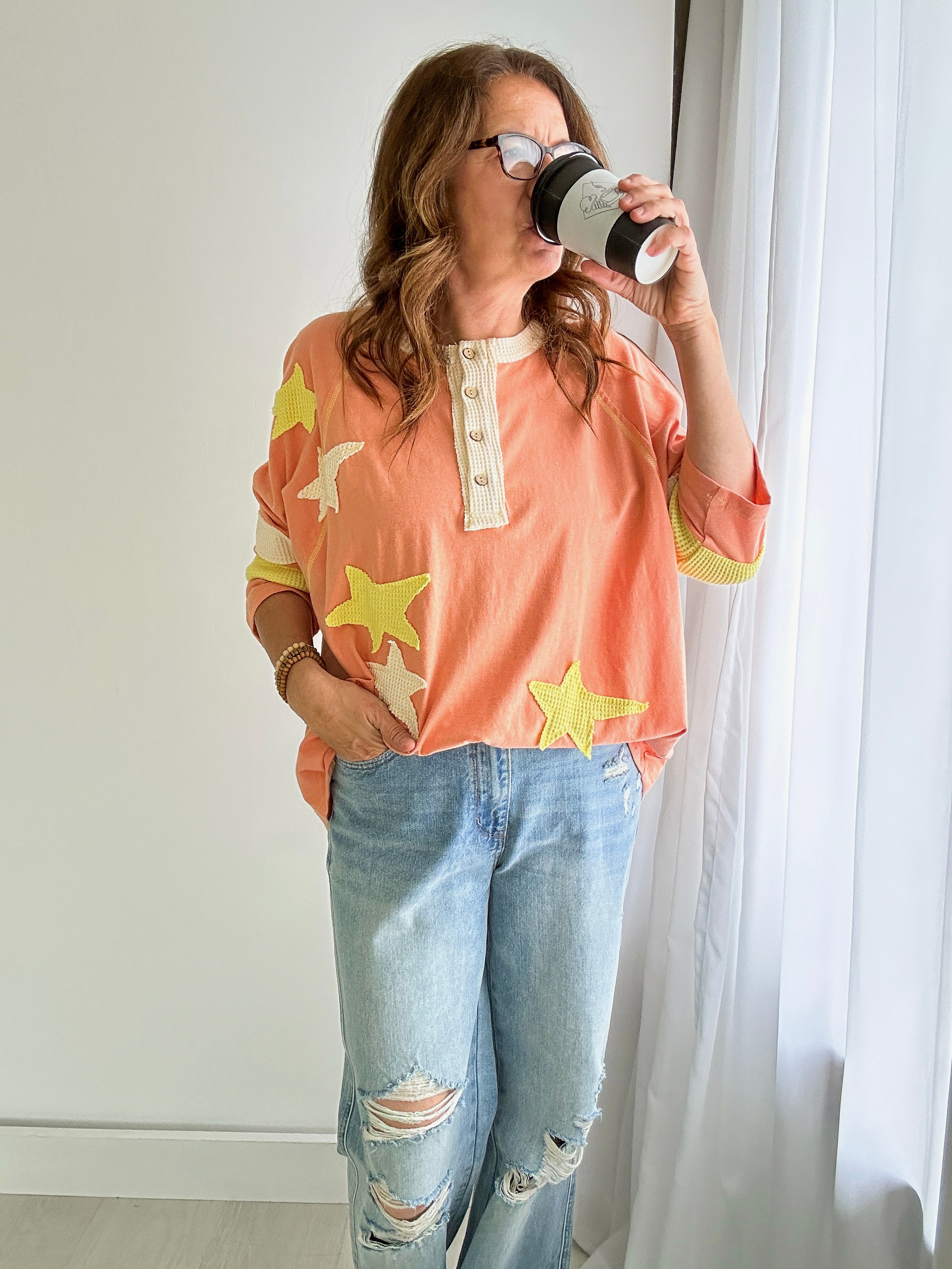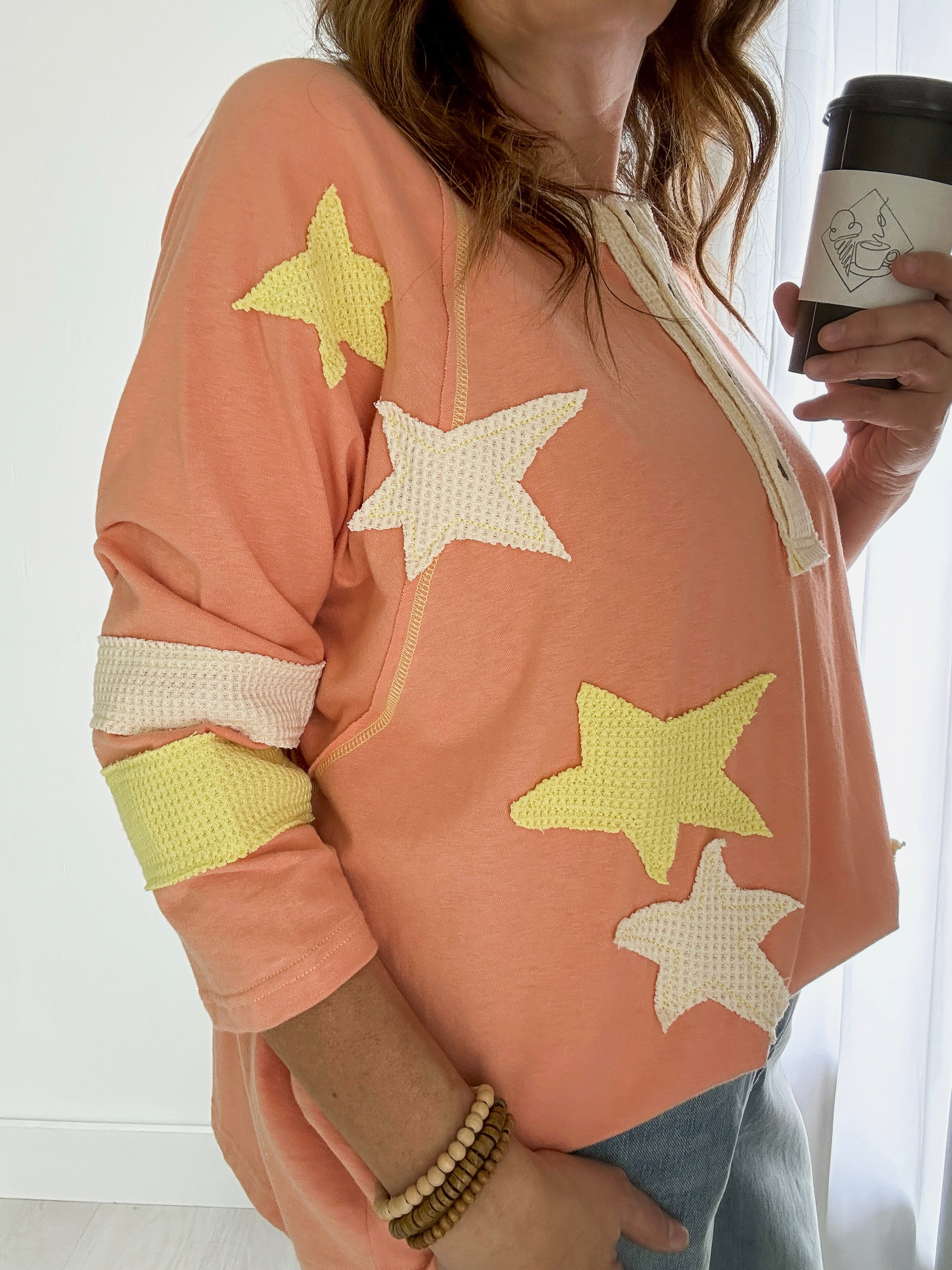 - This playful peach henley features 3/4 sleeves and a rounded button-up neckline. Showcasing eye-catching raised color block patchwork on the sleeves and charming raw-cut star detailing on the front. The relaxed, loose fit ensures comfort while maintaining style—perfect for those who want to shine!